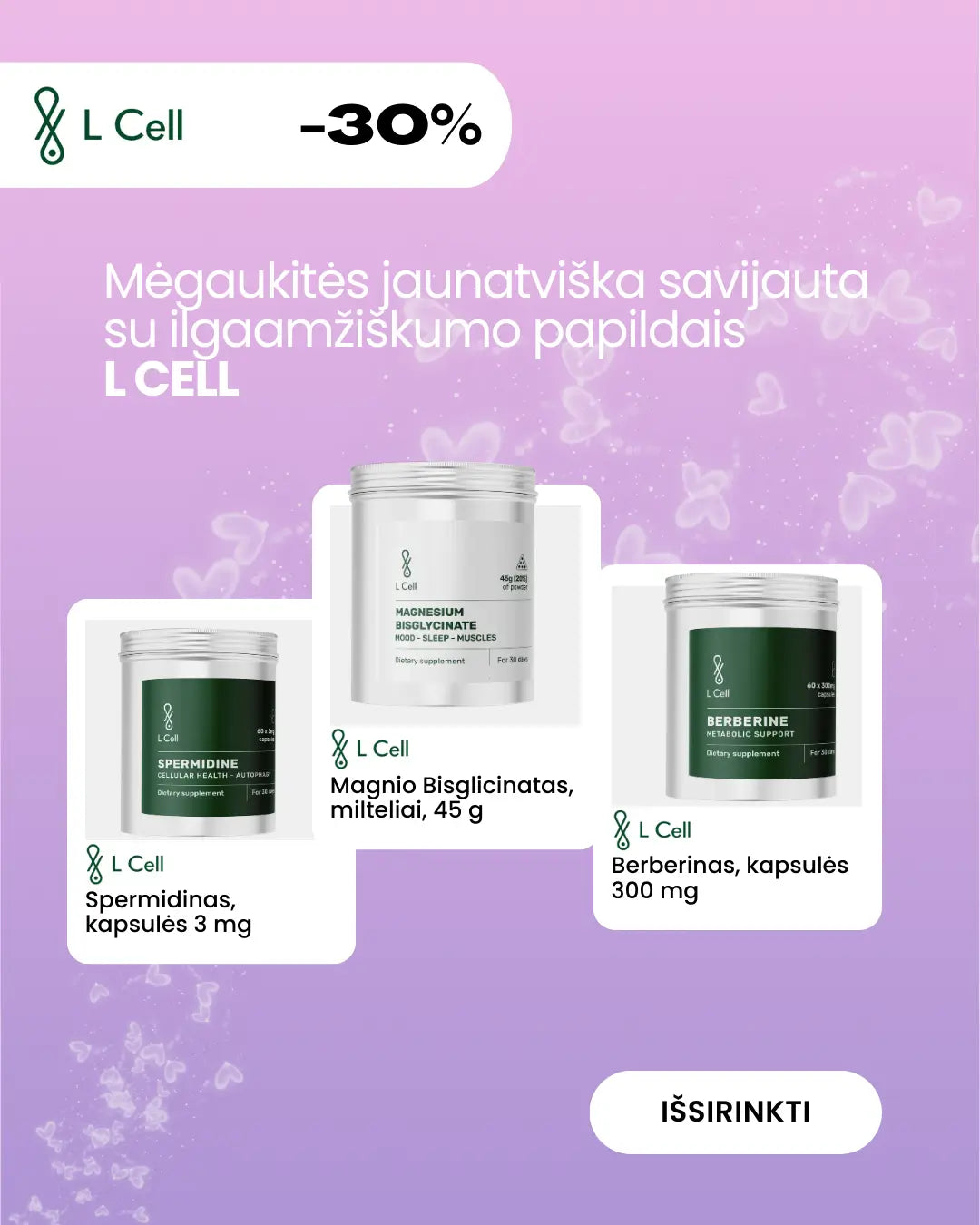 Rinkinį sudaro 3 standartiniai kolageno kursai + 5 buteliukai dovanų. Viso 35 kolageno buteliukai.