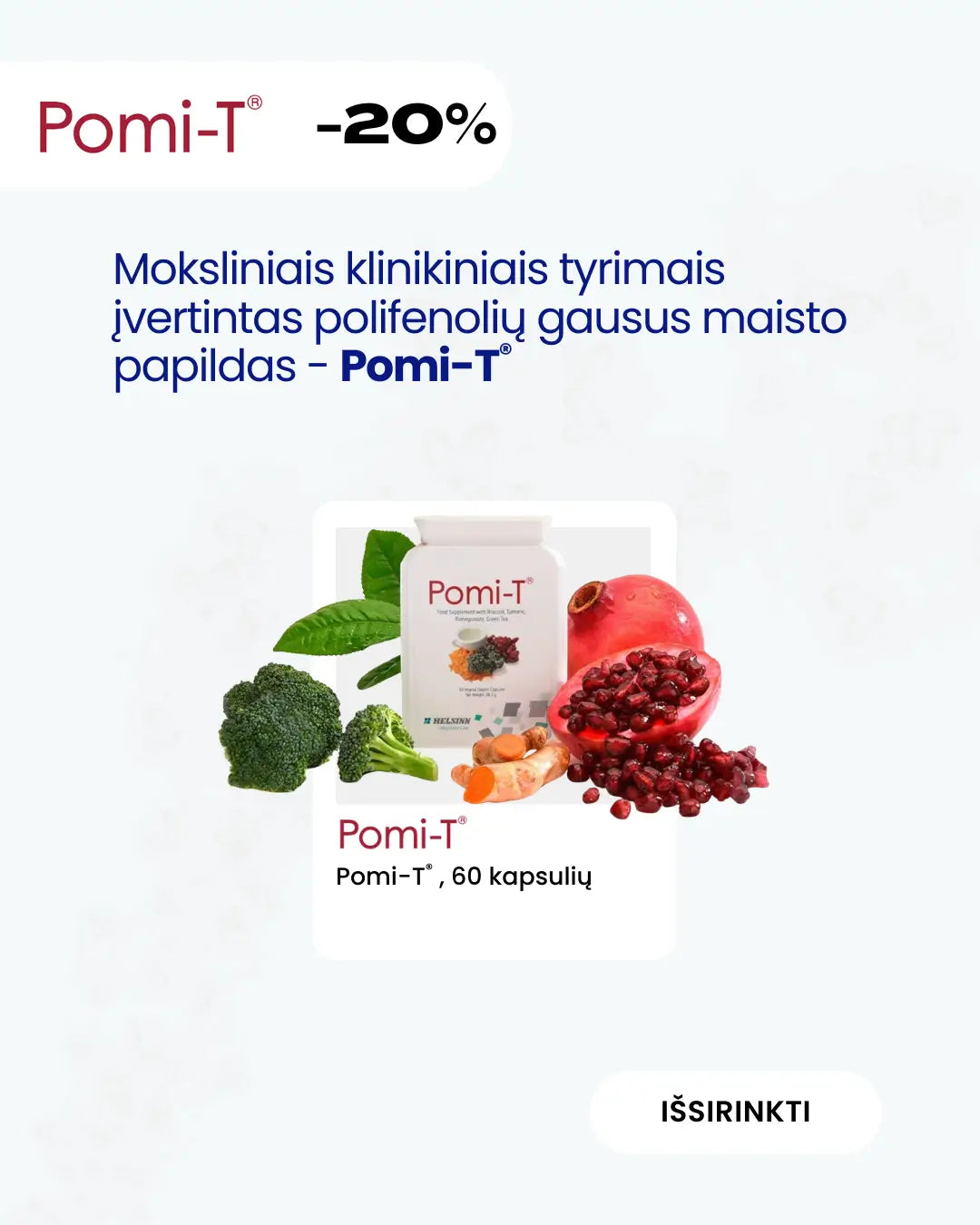 Pomi-T® – tai Jungtinės Karalystės mokslininkų sukurtas polifenolių gausių visadalių brokolių, ciberžolių, granatų ir žaliosios arbatos ekstrakto derinys, patalpintas į maisto papildo kapsulę, pasaulyje pripažintas ir įvertintas II fazės moksliniais klinikiniais tyrimais.