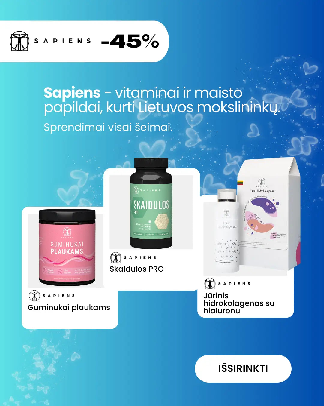 Vandenyno išmintis Jums! Kiekvienas iš mūsų norime būti gražūs, turėti lygią odą, žvilgančius plaukus, tvirtus nagus, sveikus sąnarius ir kaulus. SAPIENS Jūrinis kolagenas pagamintas pagal unikalią formulę, kurioje rasite net 10 g jūrinio kolageno, 50 mg hialurono rūgšties, 200 μg biotino bei didelį kiekį vitaminų ir natūralių ekstraktų. Itin malonaus juodųjų serbentų skonio!